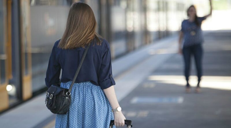 Missionária com uma pessoa ao fundo acenando